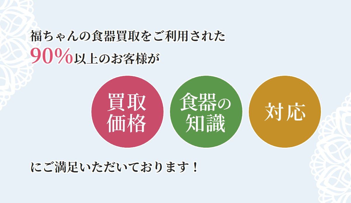 利用した90%以上のお客様が「買取価格」「食器の知識」「接客対応」で満足しています。ブランド食器では、ブランド価値に見合った価格での買取を心がけています。