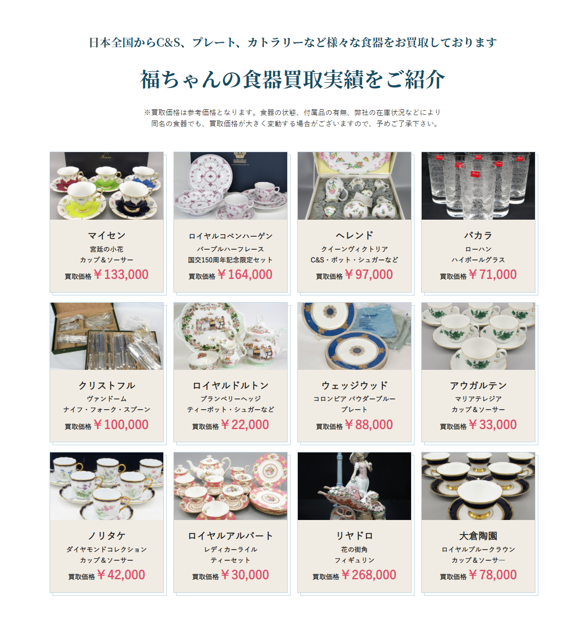 独自の販売ルートが数多くある「買取専門店 福ちゃん」は、使用済みや傷や汚れのあるものであっても、使用不可能でなければどのような状態のブランド食器でも査定可能です。